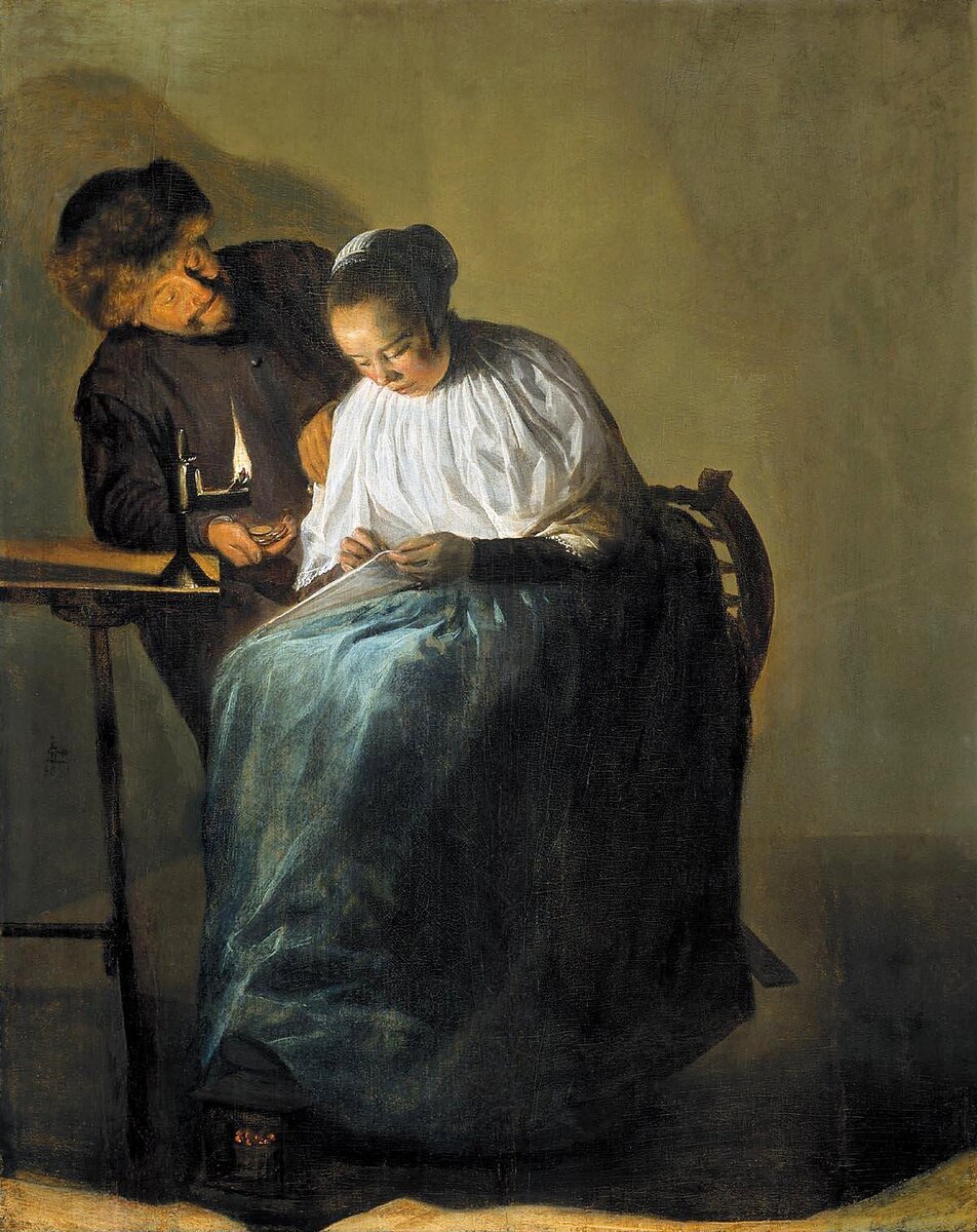 Прежде чем переходить к обещанному рассказу о том, куда «пропала» художница Юдит Лейстер во второй половине 1630-х, я покажу вам картину, которая сильно выделяется из всех тех работ, которые мы уже видели. Начнём с того, что в разных источниках она даже называется по-разному (что, впрочем, совсем не удивительно для картин старых мастеров). Сейчас картину чаще всего именуют «Предложение». Или «Мужчина, предлагающий деньги молодой женщине». Ранее также был известен вариант «Заманчивое предложение». Но самое интересное в том, что у этой картины трактовок не меньше, чем названий. Хотя, казалось бы, то, что мы видим – предельно просто. Мужчина склонился над шьющей молодой женщиной и протягивает ей правую руку, в которой отчётливо видны монеты. Какие могут быть варианты? А вот представьте себе. 1) Классическое толкование. Предложение абсолютно неприличное и неприемлемое с нравственной точки зрения. Посмотрите – облик мужчины почти чёрный. Он отбрасывает зловещую тень, а на лице явно «демонич
