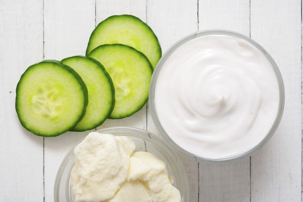 - Смешай половину свежего огурца (очищенного и измельченного) с 2 столовыми ложками йогурта.