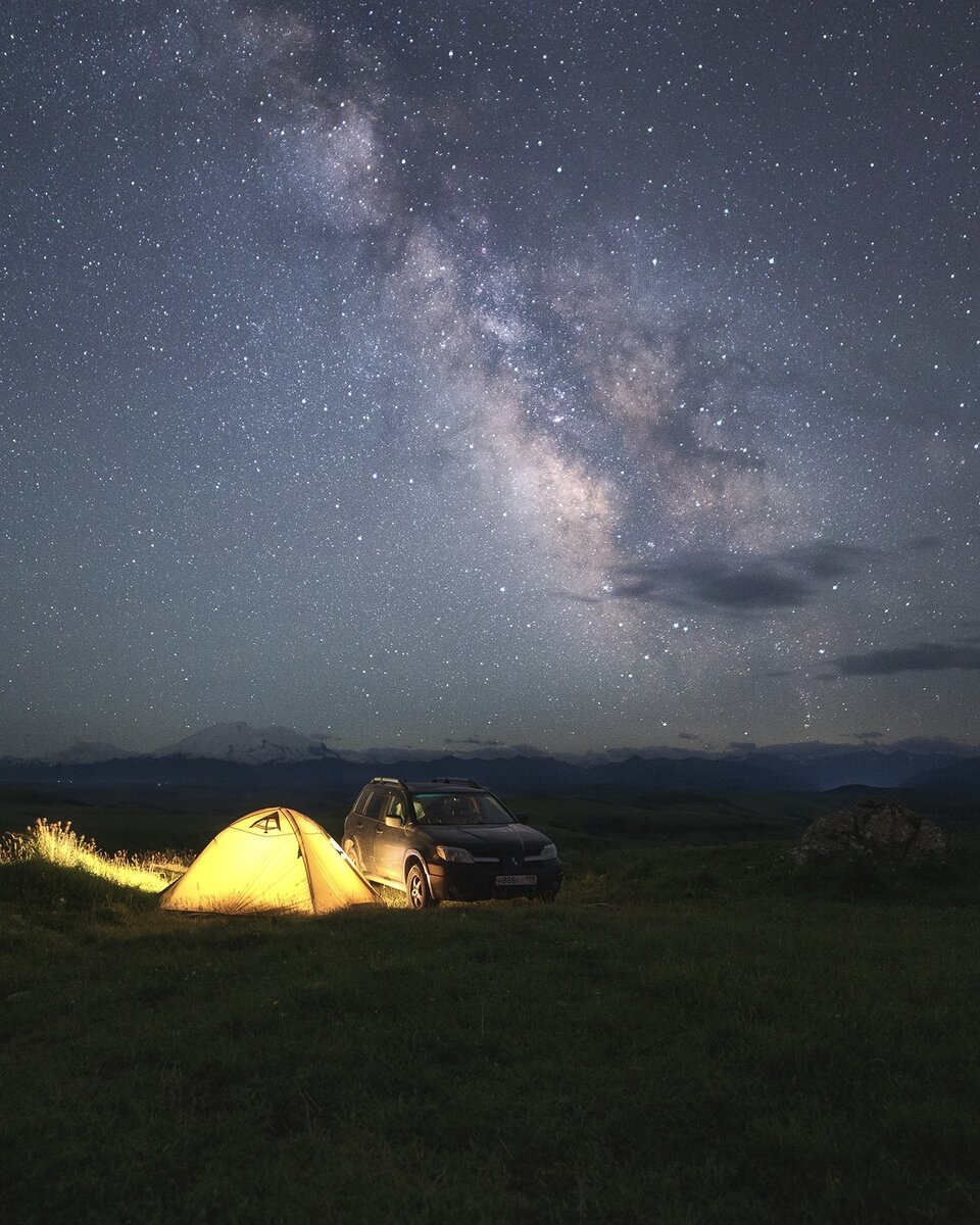 Соскучились по звёздам? Тогда держите продолжение истории из путешествия на юг. Это была моя самая первая ночь на Кавказе. Волнительная, трогательная, холодная, но горячо запавшая в душу. Мы поставили лагерь уже после заката, поэтому я толком не успела разглядеть красоты перевала Гум-Баши. Но даже ночью было видно его - величественный Эльбрус. Я честно не знала, что его видно с перевала. Это была внеплановая остановка, и мы не рассматривали перевал в качестве локации. А зря. Ночью ты не видишь всего масштаба, но вот что ты увидишь, если тебе повезёт с небом, так это южную часть Млечного Пути. И вновь меня окутало чувство собственной маленькости. Это глубоко проникающее ощущение, что наша планета - лишь песчинка в космосе. А ты - и вовсе молекула. Кому-то может стать немного не по себе, но я ощущаю свободу, мысли полностью очищаются от проблем и забот. Многие спрашивают, видно ли глазами так, как на фото. И я с уверенностью могу сказать, что на юге, в отсутствии засветок мегаполис
