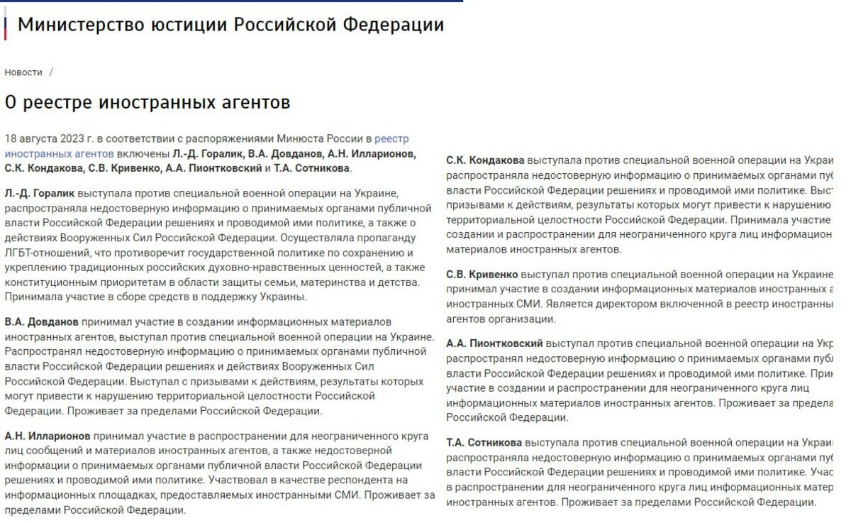 В него добавили семь физлиц. Сегодня, 18 августа, Минюст РФ пополнил список иноагентов. В реестр добавлено семь физических лиц. Политик Сарылган Кондакова (признан иноагентом на территории РФ); Публицист Андрей Пионтковский (признан иноагентом на территории РФ); Экономист Андрей Илларионов (признан иноагентом на территории РФ); Политик Сергей Кривенко (признан иноагентом на территории РФ); Журналистка Татьяна Сотникова (признан иноагентом на территории РФ); Активист Владимир Довданов (признан иноагентом на территории РФ); Писательница Линор Горалик (признан иноагентом на территории РФ). Ранее Readovka писала о том, что владельца «Хортицы» заочно арестовали в Москве по делу о финансировании ВСУ.