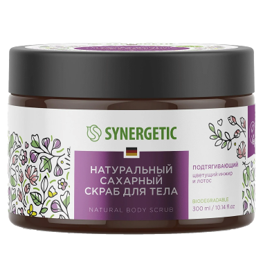 Российская марка Synergetic знакома нам по их отличной бытовой химии, которая подходит, кажется, чуть ли не для всех поверхностей и комнат в доме. Но средства по уходу за кожей бренда я тестировала впервые. Для начала я попробовала сахарный скраб с цветущим инжиром и лотосом — тестировала его неделю. купить 256 руб. Сахарный скраб для тела «Цветущий инжир и лотос», Synergetic В круглой упаковке находится достаточно плотный и действительно сахарный (в том числе и на вкус) скраб, его много, целых 300 мл, так что, даже нанося большое количество средства по вечерам, я все равно едва ли израсходовала четверть банки. Распределяется скраб легко, пару раз для более плавного нанесения я смешивала его с водой, и тогда частички не расплывались по телу, а просто лучше скользили. Так что, если вы не любите сильное скрабирование, можете набрать немного скраба в руку и смешать его с водой, масса станет более жидкой и легко уберет шелушения. Главные компоненты в составе — масло миндаля, экстракты инжи