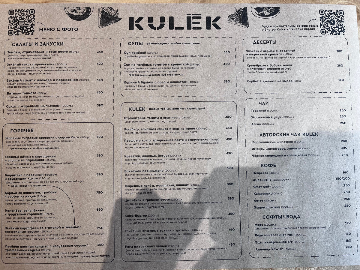Заведений в Москве открывается много, несмотря на все (или даже под) рассказы о том, как все плохо. Район Никитской уже давно полон отличных мест, и я распробовал ещё одно, чего и вам желаю. KULEK Где: Москва, Большая Никитская, 23/14/9 Есть ещё в Депо на Лесной, на Центральном рынке и Автозаводской (которая кажется переживает новое рождение учитывая сколько офисов брендов и редакторов и общепита там стало) Средний чек: 750 рублей Открылись ребята месяца полтора назад на месте кафе с десертами и завтраками в американском духе, которое вечно не принимало карты и, вероятно, невыдерживало конкуренции с Conversations и Friends Forever в шаговой доступности. В итоге новое место мне так приглянулось, что за месяц я сходил туда трижды и вот почему: Почему оно: Открытая кухня, за работой которой можно (и интересно) наблюдать; Симпатичный сдержанный интерьер в светлых тонах. На одной из стен портреты дам в шляпках и драгоценностях с фирменным блюдом в руках. На другой изречения на латыни.