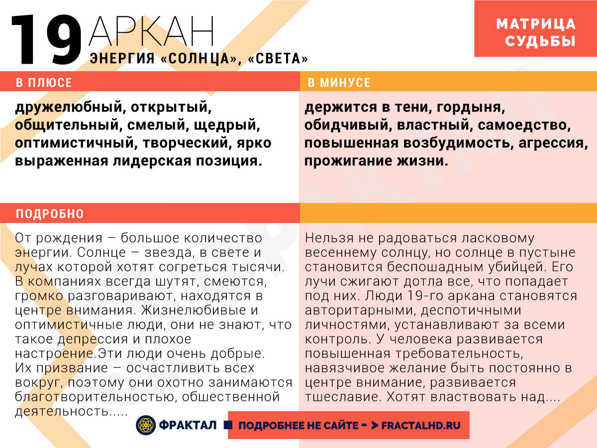 Люди 19-го кода судьбы обладают непреодолимым желанием светить, что означает, что они безусловно отдают свои творческие способности и энергетический потенциал миру и людям. Они открыты и обладают мощной энергией, подобно солнцу, которое светит всем, без исключения. Они сами решают, будут ли они активно включаться в начавшийся день или нет, но вокруг них всегда собирается множество людей.