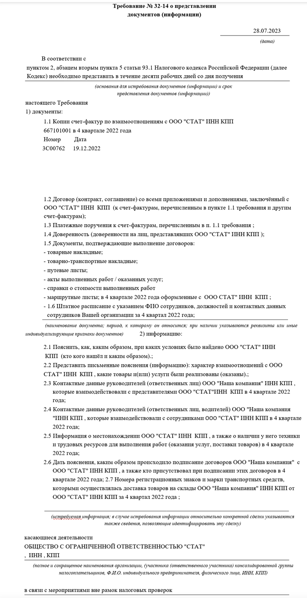 В один прекрасный день налоговая инспекция направила ему 16 требований - каждое по взаимоотношениям с конкретным поставщиком. Все требования были однотипные и содержали запрос полной информации и документов по сделкам.