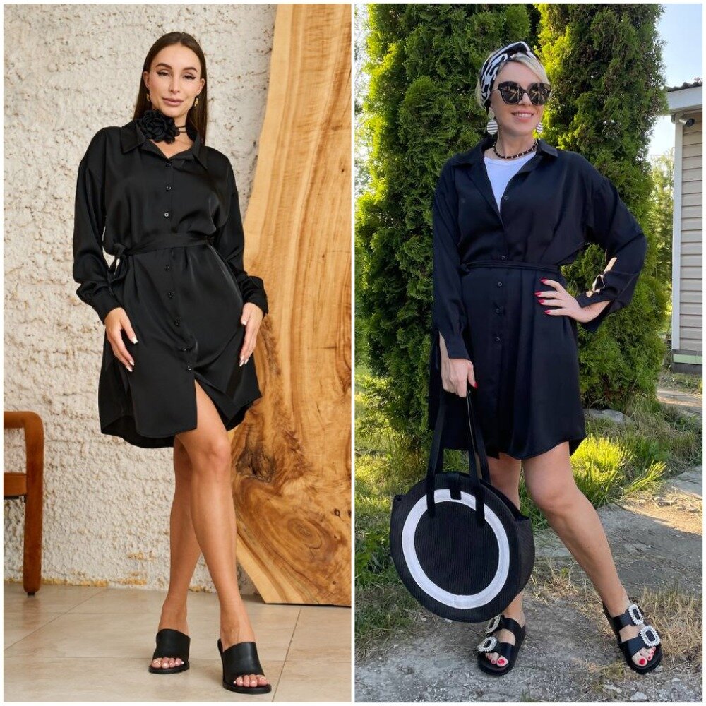 Для тех, кому надоели платья-рубашки в длине миди, я нашла мини-вариант. Там много расцветок и видов (не только рубашки, но и просто платья), я выбрала наиболее, так скажем, скромную модель - в черном цвете. Мне это платье показалось самым интересным для тех, кому за 50. Хотя кто-то скажет, что нам мини вообще нельзя...А я скажу, что с красивыми ножками можно всё! Так вот, платье мне очень понравилось, не смотря на состав, который многих смутит. Я надела его на топ, было абсолютно комфортно, ткань легкая и шелковистая, и при этом плотная. Можно носить в качестве накидки. Длина хорошая - платье не смотрится вульгарно. Довольно универсально: можно составлять и образы с кедами, и с босоножками. Вполне носибельно не только летом. Размеры до 50. Цена абсолютно приемлемая.