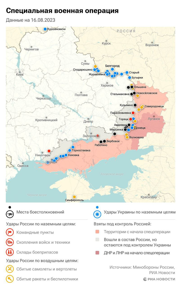 Оперативно-тактической и армейской авиацией, ракетными войсками и артиллерией нанесено поражение живой силе и военной технике в 143-х районах. Уничтожено до 735 бандеровцев, 11 бронированных машин, 4 артиллерийские системы, 12 автомобилей, 2 РЛС и 26 БПЛА. Авдеевское направление. Подразделениями «Южной» группировки войск в тесном взаимодействии с авиацией и артиллерией отразили 5 атак подразделений ВСУ в районах н.п. Красногоровка и Невельское. В районе н. п. Парасковиевка поражен пункт управления ВСУ. В районе г. Торецк уничтожен склад боеприпасов ВСУ. Направление Великой Новоселки и Угледара. Подразделениями ОБТФ «Каскад» совместно с подразделениями группировки войск «Восток» нанесено поражение врагу в районе н. п. Старомайорское. В районе н.п. Работино не прекращаются попытки наступления ВСУ. Накат за накатом украинские подразделения пытаются вклиниться в нашу оборону, используя бронетехнику и малые пехотные группы. Территория заминирована, что усложняет врагу попытки контрнаступле