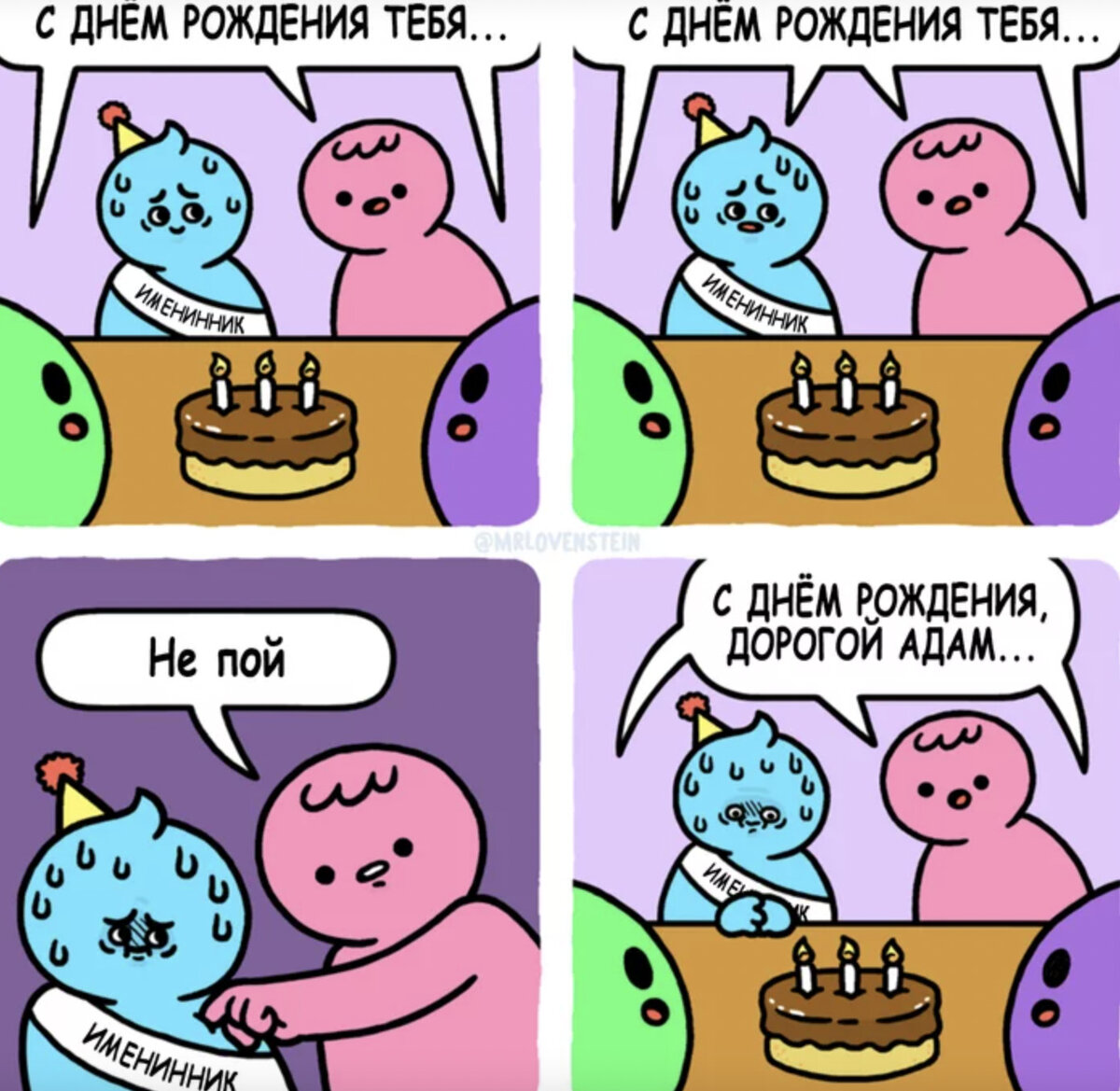 Привет, дорогой друг! День рождения — грустный праздник, особенно когда тебе за 30. Но! Любой возраст хорош по своему и каждый новый год прибавляет нам мудрости :) Подборку комиксов, в которой ты оказался, я хочу посвятить этому одновременно светлому и грустному празднику. Каждый из героев сегодняшних комиксов относится к дню рождения по-разному. Уверен, в одном из сюжетов ты точно найдешь себя! Герои истории Mr. Lovenstein любят праздновать день рождения громкими поздравительными песнями. Только вот имениннику установили табу на подпевание… Ведь поздравлять самого себя не культурно) Интересно, зачем современным гаджетам знать дату нашего дня рождения? Очень сомневаюсь в том, что героя комикса System32Comics будет поздравлять с днем рождения принтер. Вот, как смотрит истинный пессимист на свой каждый день рождения. Предлагаю хоть немного развеселить героя истории Gudim. Друг, не все так плохо! Еще одна история о пессимистах, только уже от Last Place Comics. Тут, надеюсь, его развеселят