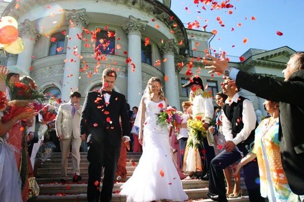 Цветы часто используются в свадебных обрядах Трудно представить свадьбу без цветочного оформления, разнообразных букетов, композиций, венков и арок. Живые дары природы всегда гармонично вписываются в окружающую обстановку, создают красивое пространство. Не удивительно, что цветы издавна используются для свадебных обрядов. Они способны запечатлеть момент воссоединения молодоженов, защитить их от сглаза и порчи, сделать торжество незабываемым и особенным. Свадебный букет невесты Образ любой невесты дополняет свадебный букет, выполняющий несколько важных функций во время церемонии бракосочетания. Цветы должны быть обязательно живыми и сочетаться с платьем невесты, соответствовать выбранному стилю свадьбы. Правильно использовать белые и розовые цветы, являющиеся символом чистоты, непорочности, молодости. Яркие букеты тоже снискали популярность. Они выгодно смотрятся на фоне белого наряда. Свадебный букет в руках невесты привлекает всеобщее внимание Согласно обычаю, букет невесте дарит жен