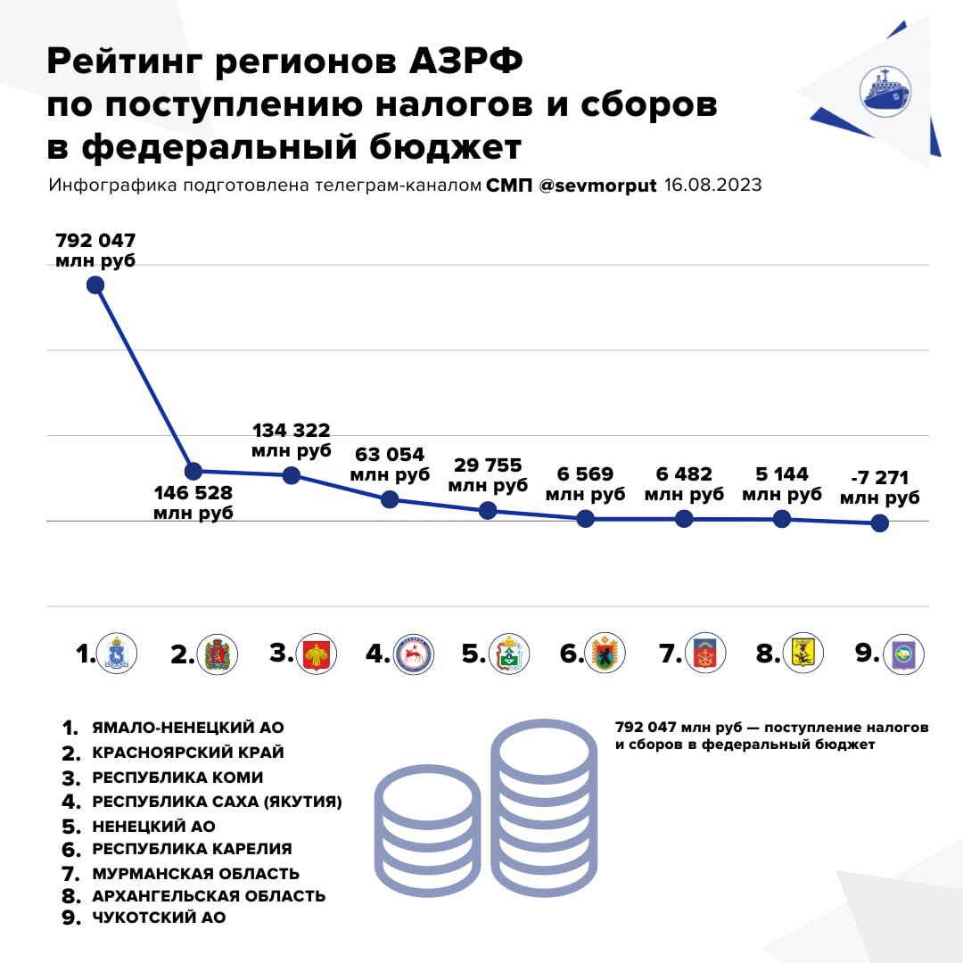 В январе-мае 2023 года регионы Арктики перечислили в федеральный бюджет почти 1,2 трлн рублей или 13,3% от всех поступлений страны. Более половины этой суммы внес возглавляемый Дмитрием Артюховым Ямало-Ненецкий АО. Округ отдал в бюджет страны более 792 млрд рублей или 79,4% всех собранных на Ямале налогов. Это самая высокая доля среди всех регионов Арктики. На втором месте расположился Красноярский край под управлением врио губернатора Михаила Котюкова. Он обеспечил 2,3% всех поступлений в федеральный бюджет, отдав ему 48,5% собранных в регионе налогов — более 146,5 млрд рублей. На третьем месте оказалась Республика Коми, которой руководит Владимир Уйба. Коми дала бюджету 1,3% поступлений — свыше 134 млрд рублей. Это 74,8% всех денег, собранных в республике. Ещё 1,2% бюджету принесла Якутия под управлением Айсена Николаева. Это 63 млрд рублей или 38% всех поступлений региона. Остальные регионы АЗРФ принесли бюджету менее чем по полпроцента каждый. По 0,3% дали возглавляемая Александром