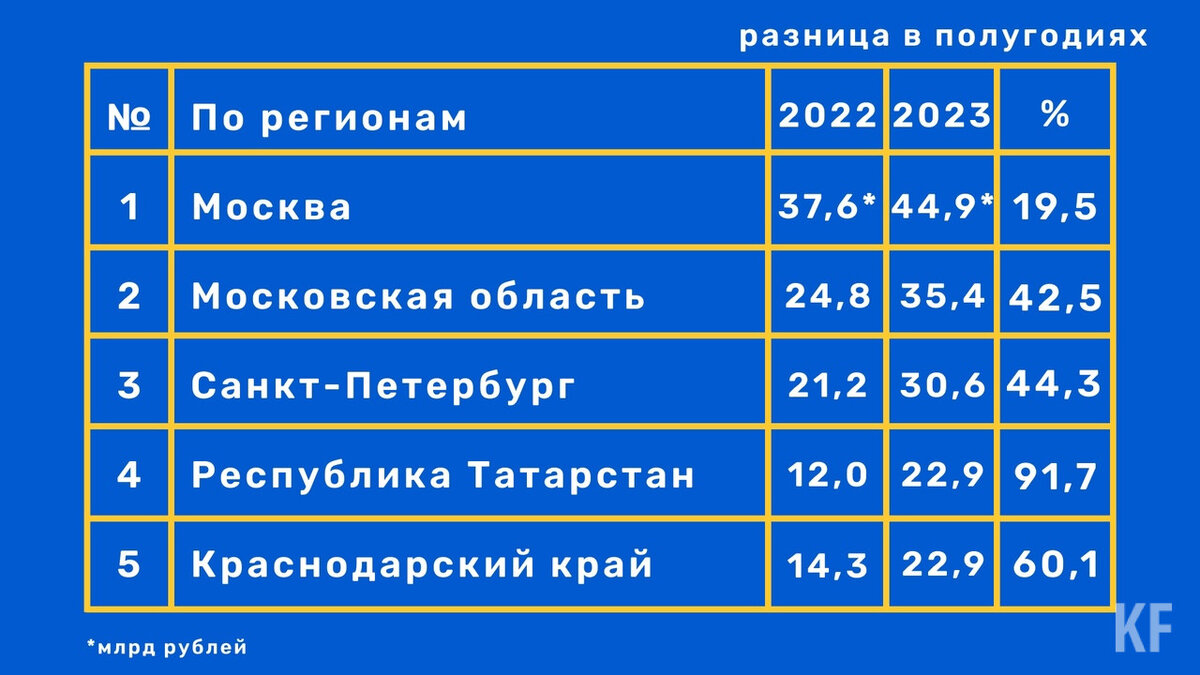 Первое место в рейтинге заняла Москва, где выдали автокредитов на 44,9 миллиарда рублей, второе – Московская область, здесь на покупку автомобиля жители взяли 35,4 миллиарда заемных средств, а третье – Санкт-Петербург, где банки выдали 30,6 миллиарда рублей на автокредиты. По сравнению с аналогичным периодом прошлого года в январе-июне 2023 года самую серьезную динамику роста объемов выданных автокредитов (среди 30 регионов-лидеров в этом виде розничного кредитования) продемонстрировали Татарстан (+91,7%), Вологодская область (+90,0%), Башкортостан (+89,5%), Челябинская область (+84,6%) и Пермский край (+81,4%). В Москве и Санкт-Петербурге рост этого показателя составил 19,5% и 44,3% соответственно.