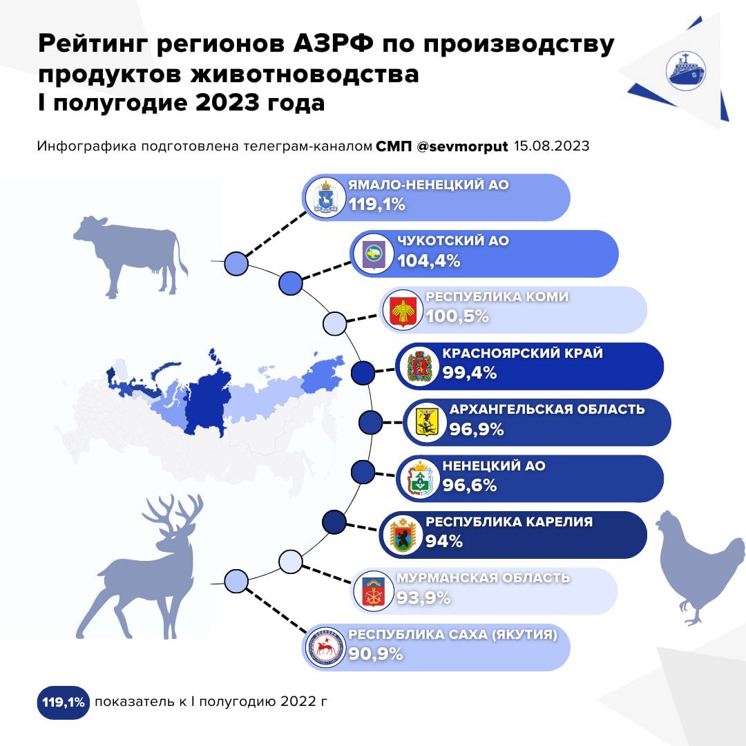 Традиционно арктические регионы считаются промышленными и сырьевыми. Но в субъектах АЗРФ идет и полноценное развитие сельского хозяйства. Особенно это касается животноводства и птицеводства. За первое полугодие сельхозпредприятия Арктической зоны произвели более 114 тысяч тонн мяса скота и птицы. И по темпам производства регионы не сильно уступили аналогичному периоду прошлого года. А некоторые даже приросли.