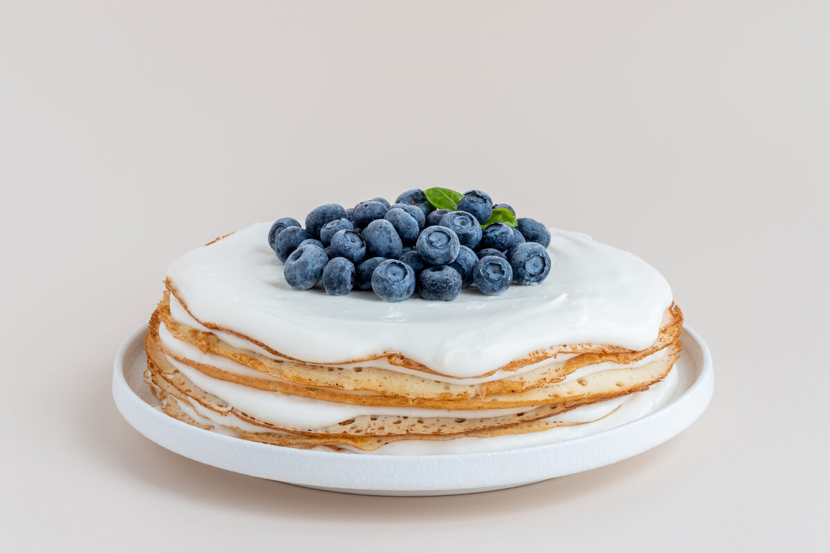 Если вы не понимаете блинные торты, попробуйте этот. Я всегда думала, что блинные торты не вкусные, пока не попробовала испечь сама. Очень-очень достойный рецепт — простой и почти без Ккал. На торт понадобится 7 блинов. Но мы сделаем их в 2 раза больше — с запасом, чтобы точно хватило, если вдруг какой-то блин будет «комом». У меня сковорода с дном 18 см. Рецепт блинов без глютена Все ингредиенты, кроме горячей воды, перемешать в блендере. Добавить горячую воду, еще раз перемешать. Тесто готово, можно печь. Блинчики должны быть не очень толстыми и обязательно с дырочками, чтобы потом слои торта хорошо скрепились между собой. Рецепт крема Рикотту и йогурт заранее достать из холодильника, чтобы были комнатной температуры. Желатин (10 г) залить холодной водой (50 мл) и оставить на 15 минут. Рикотту, йогурт, подсластитель и ваниль перемешать венчиком. Желатин нагреть (не сильно! только до растворения желатина) и добавить в крем, тщательно перемешивая венчиком. Сборка торта Блины немного ос