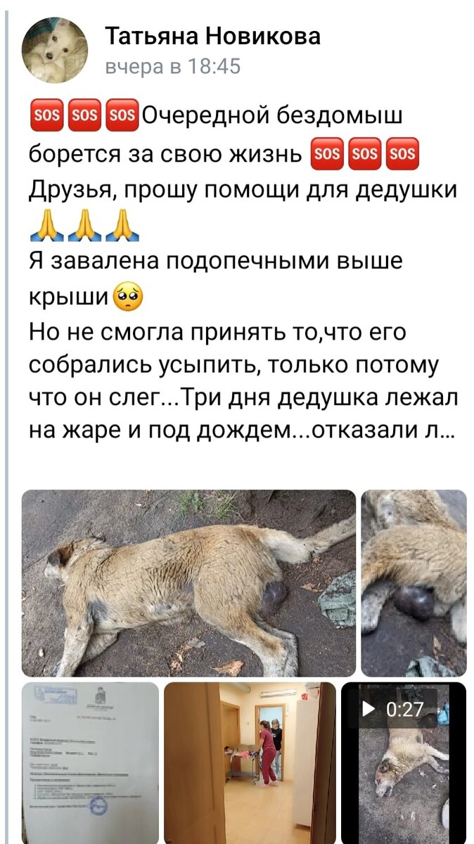 🆘Прошу, остановите зоошизанутых! 🙏 У нас в порту старый пёс живёт, он вчера слег. Собаке 15 лет, у него онкология. В общем мы собрали на усыпление деньги, в чате своём, а женщина по имени Татьяна Новикова ворвалась в этот чат, обозвала всех нелюдями и забрала собаку на лечение. Теперь деньги собирает. Вчера в ветеринарке сделали только УЗИ и кровь. Вкололи обезбол и все. мол наблюдаем. На то, что бы отпустить собаку она и слушать не хочет.Облила грязью всех, мол нелюди, собака 3 дня лежала на жаре, все мимо ходили. Узнала, что эта женщина не первый раз уже связана с мутными сборами на бездомных животных, поэтому прошу предать огласке. Делать деньги на умирающей собаке - это мерзко! Вот её пост👇 https://m.vk.com/wall375307083_5302