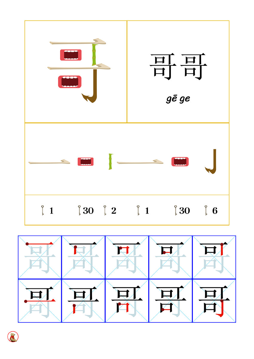 Иероглиф 哥 - сложный иероглиф с вертикальной структурой.