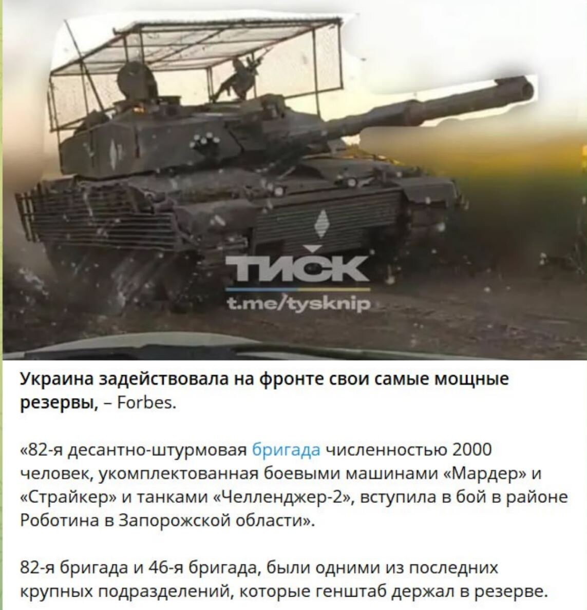 Зап.СМИ ссылаясь на своих военкоров и агентов в Киеве пишут, что /цитата/: «На Запорожско-Таврическом направлении ВСУ бросили в бой одну из последних резервных бригад - 82-ю. Она укомплектована боевыми машинами "Мардер" и "Страйкер", а также танками "Челленджер-2". Бригада вступила в боевые действия в районе Работино несколько дней назад и считается одним из самых боеспособных украинских подразделений. 82-я и 46-я бригады были одними из последних крупных подразделений, которые ГШ держал в резерве. /самое интересное/ Когда 46-я и 82-я бригады отступят для отдыха и ремонта, может не оказаться столь же мощных свежих бригад, которые могли бы заменить их. Контрнаступление может потерять темп. В районе Работино - села под Ореховым на первой линии обороны россиян (которое ВСУ штурмуют еще с начала июня) идут тяжелые бои». Наиболее известный немецкий аналитик Рёпке пишет, что Работино уже взяли, но этого не подтверждает даже ГШХ. По словам наших морпехов 810-й бр., бои идут на северных окраина