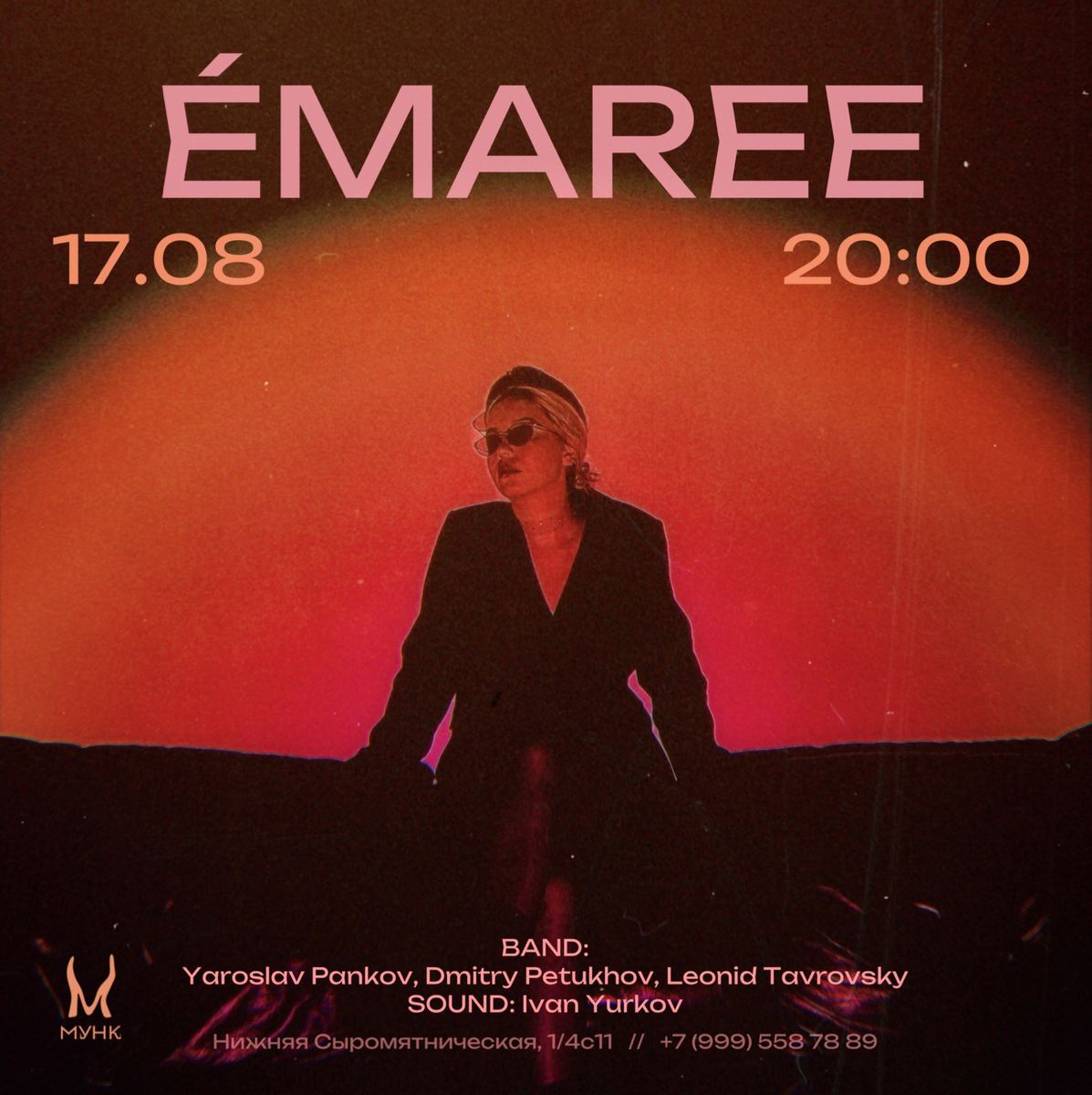 Музыкальное мероприятие состоится в баре МУНК 17 августа в 20:00. В этот вечер на сцене для гостей выступит певица ÉMAREE, песни которой представляют меланхоличный гламурный поп и отражают баланс между кинематографичными аранжировками и девичьим вокалом. Она сама пишет свою музыку, в том числе в соавторстве с участниками группы passmurny. Ее песни на английском языке идеально дополняют балладное звучание, рэп и танцевальные мотивы и, конечно, рок. Этот музыкальный микс в творчестве артистки никогда не оставляет равнодушными слушателей. Вместе с ÉMAREE атмосферу вечера дополнят музыканты Ярик Панков, Лёня Тавровский и Дима Петухов. Поддержит исполнительницу и ее команду своим выступлением ACY MOJO с новым синглом «Рутина» и фитом с певицей под названием «Promises». Билеты по ссылке: https://moscow.qtickets.events/79601-emaree Бронь столов: +7 (999) 558-78-89