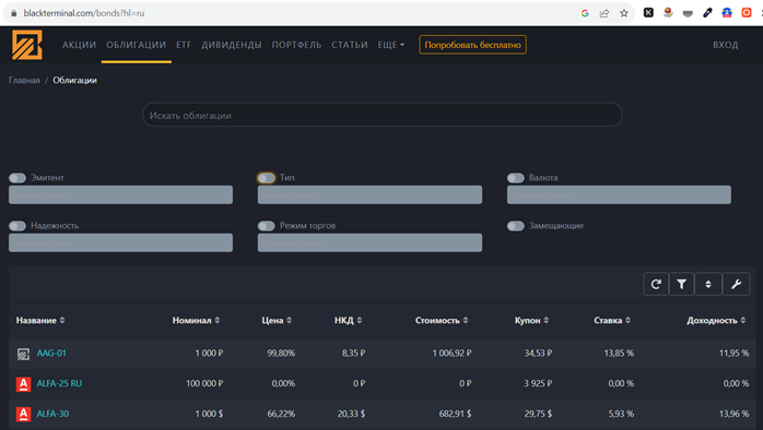 Чаще всего я пользуюсь сайтом https://blackterminal.com/, потому что они очень подробно расписывают, сколько нужно заплатить за облигации, сколько можно с них получить, какая будет годовая доходность и из чего она складывается.