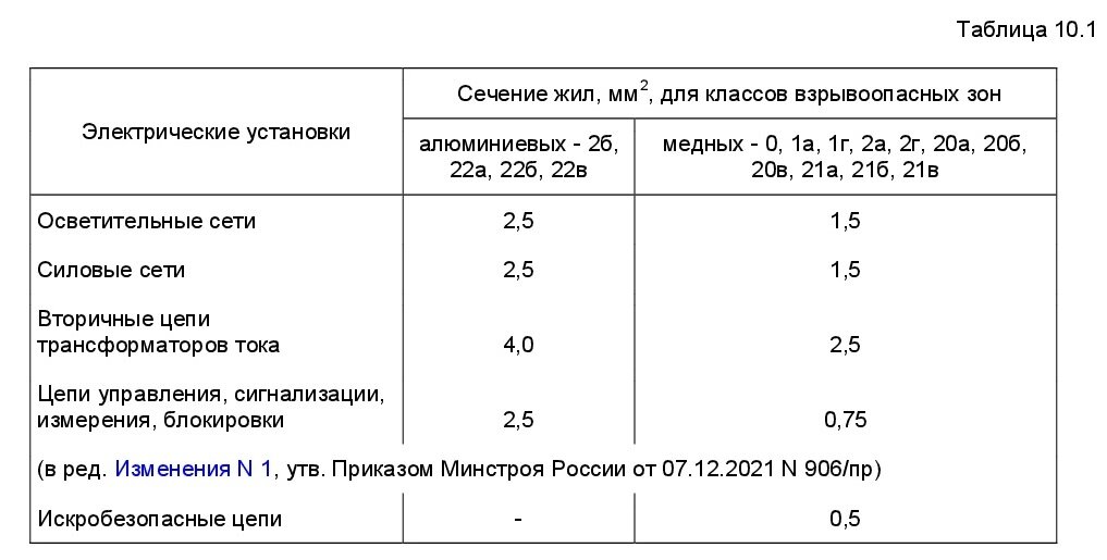 10.2.6 Сечения проводников должны соответствовать расчетным значениям, но наименьшие допускаемые сечения кабелей с медными и алюминиевыми жилами для прокладки во взрывоопасных зонах всех классов должны быть не менее значений, приведенных в таблице 10.1.
