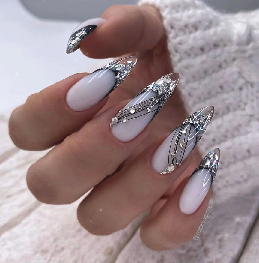 Форма стилет хороша тем, что позволяет мастерам нейл-арта вовсю развернуть свои творческие возможности. На длинные ногти можно нанести сложные рисунки, декор, они идеально подходят для различных спецэффектов. Для стилетов подойдут самые разные украшения — блёстки, стразы, акриловая лепка, фольга.