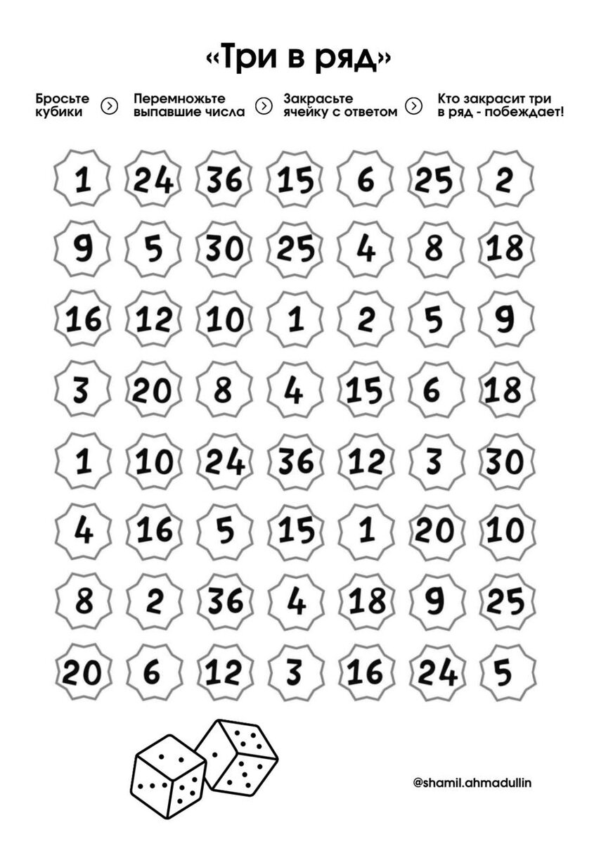 Каждый игрок по очереди подкидывает кубики, перемножает выпавшие цифры, а затем на поле находит это значение и раскрашивает (в любом окошке, где захочет). Задача игроков: собрать три закрашенных окошка подряд по вертикали, горизонтали или диагонали. Хорошей вам игры!