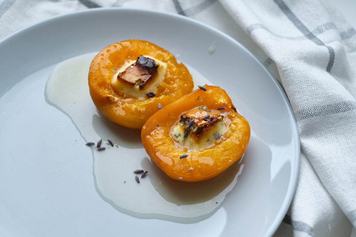 Сегодня мы пофантазируем на тему великолепной летней закуски под белое вино – запеченные абрикосы с мягким сыром. Что понадобится? Абрикосы — 16 штук Орехи пекан или грецкие (какие вам больше нравятся) — 60 гр. Мягкий козий сыр — 200 гр. Мёд — 15 мл. Что делаем? Шаг 1. Включаем духовку, чтобы разогревалась до 180°С. Шаг 2. Разрезаем абрикосы пополам и удаляем косточки. Выкладываем на застеленный пергаментом противень. Шаг 3. Мельчим орехи и разминаем сыр, перемешиваем их. Фаршируем этой смесью абрикосы, сверху поливаем медом. Шаг 4. Запекаем 10 минут в духовке. Шаг 5. Даем остыть. Едим с удовольствием. Приятного аппетита!