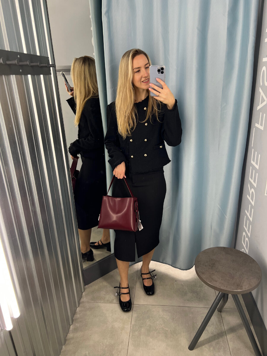 Жакет в стиле Chanel с золотыми пуговицами (арт. 2331617617) дополнила юбкой-миди (арт. 2331209209) и лакированными туфельками Мэри-Джейн.