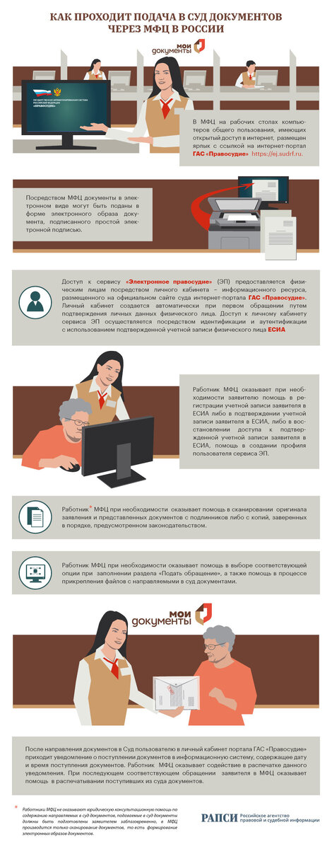 В суд через МФЦ. Объясняем, как теперь можно подать иск У жителей всех российских регионов появилась возможность подать исковое заявление в суд через многофункциональные центры (МФЦ), сообщает Российское агентство правовой и судебной информации (РАПСИ). РАПСИ публикует инфографику, которая подробно объясняет процесс обращения в суд через МФЦ шаг за шагом. Документы можно подать в виде «электронного образа», то есть отсканировать. Доступ в систему «Электронное правосудие» предоставляется гражданам в личном кабинете ГАС «Правосудие». Личный кабинет создается автоматически при первом обращении. Важное уточнение — в МФЦ нужно прийти с уже подготовленными документами для подачи иска. Сотрудники МФЦ могут помочь с подачей документов технически, но не смогут дать юридическую консультацию по составлению иска.
