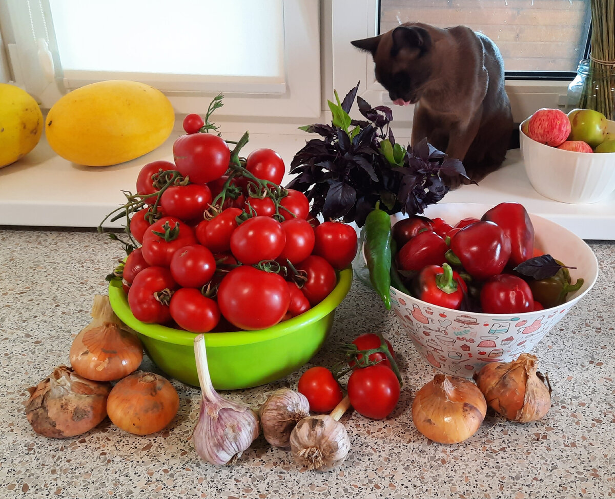 Август. Помидоры на грядках уде достигли своей спелости: сладкие, наливные. Перцы показывают свои румяные бока. Значит пришло время заготавливать вкуснющюю аджику. Соус который можно применить везде: в заправку, к хлебушку, на пиццу. Для приготовления аджики потребуется: Помидоры - 4 кг. Перец кр. - 1,200кг Лук репка - 0, 500 гр. Базилик - 100 гр( листья) Соль - 2 ст.л( 60гр) Сахар - 4 ст.л( 80 гр) Уксус 9% - 2ст.л( можно винный уксус) Чеснок - 2 головки. Перец Чили- 2 шт. Перец чёрный -1/4ч л. Растительное масло - 100 мл. Все продукты в чищенном виде. Помидоры режем на дольки и ставим запекаться в духовку при температуре 200 гр. на 30 минут. У меня вышло 2 противень. В момент запекания из помидор выходит влага которая нам будет не нужна. Помидоры все разные и если у них была толстая шкурка рекомендую запечённые томаты пробить блендером и протереть через сито. Так соус будет нежнее. Сок отошедший от помидор не выливайте, он может пригодится, если соус будет густой. Лук режем произ