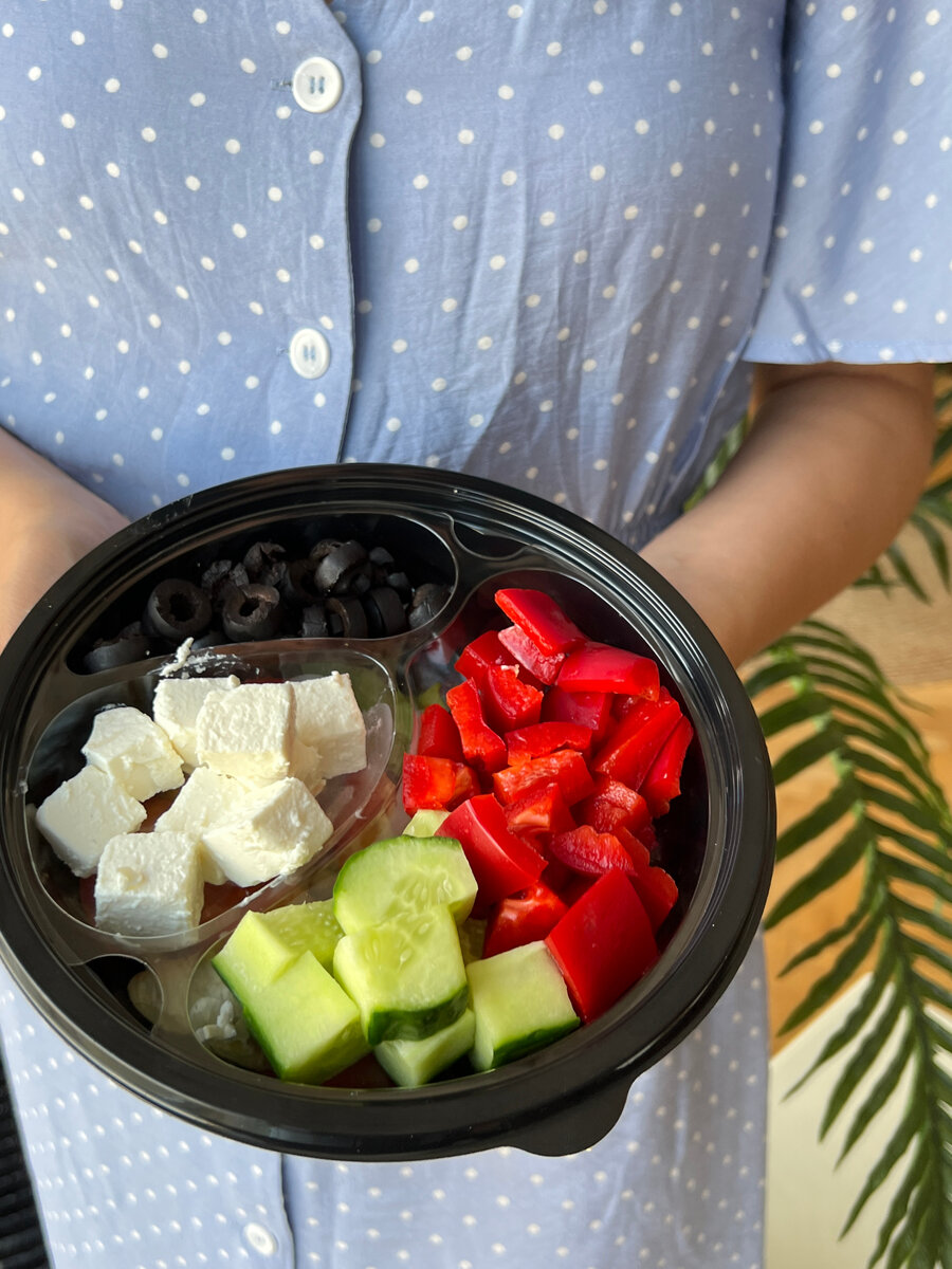 Состав: сыр фетакса, свежий огурчик, маслины, салат айсберг, масло оливковое, свежий помидор, болгарский перец. 2. Салат Цезарь с курицей или креветками.