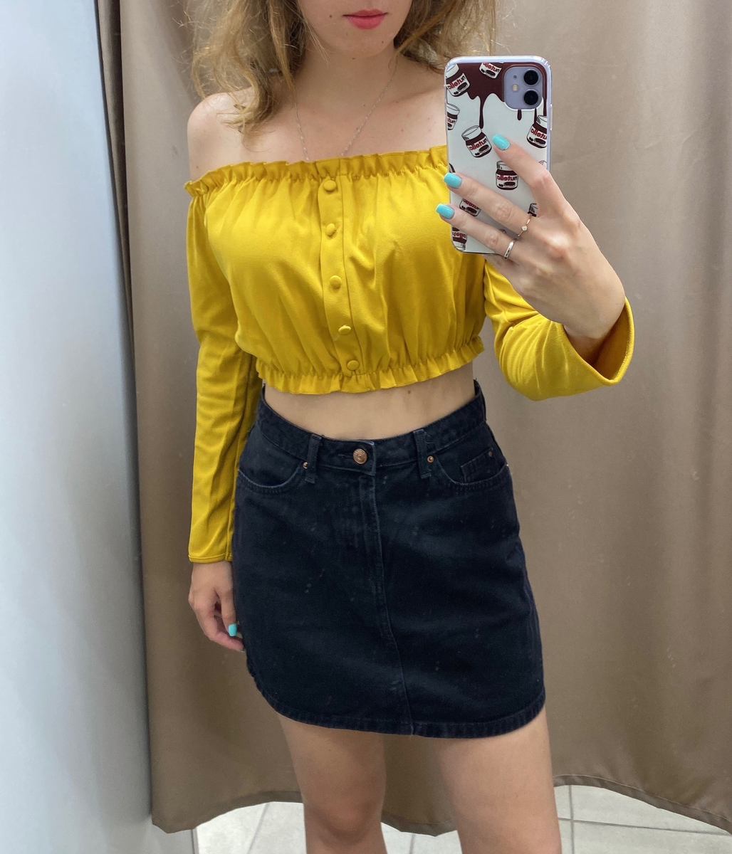 Временами мне хочется носить максимально женственную одежду. Такое бывает, когда надоедают футболки, шорты и джинсы. Именно для таких моментов я приобрела два одинаковых топа - они отличаются только по оттенку. Они меня покорили со второго раза. Расскажу, как всё было и почему чуть не прошла мимо них. Когда просматривала вещи на вешалках, сначала мне попался жёлтый топ. Он был маленького размера, кажется, XS. Выглядел действительно небольшим и я решила, что всё равно в него не влезу. Да и показалось, что с фасоном что-то не так. А потом попался ещё один жёлтый топ, точно такой же, но на размер больше. И к нему уже присмотрелась - решила, почему бы и не примерить? Почти следом за ним ещё и изумрудный попался, его решила тоже захватить. Ну а вдруг? Ещё я выбрала чёрную юбочку из джинсовой ткани. Её, кстати, купила. Вот всё вместе и примеряла. Вот так выглядит жёлтый топ - плечи полностью открыты, а я как раз люблю такую одежду. Мне кажется, что она смотрится очень женственно. Фасон симпа