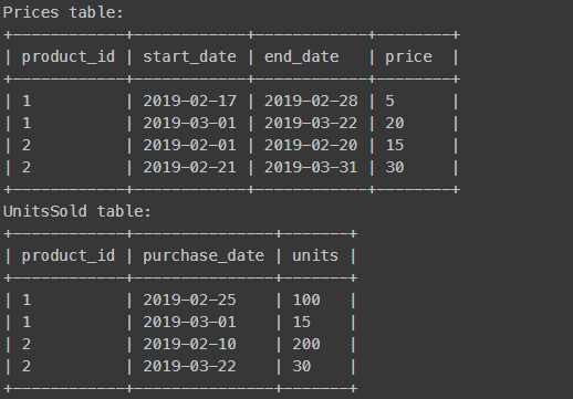 Для каждого product_id не будет двух перекрывающихся периодов. Это означает, что не будет двух пересекающихся периодов для одного и того же product_id. Таблица: UnitsSold Для этой таблицы нет первичного ключа, она может содержать дубликаты.