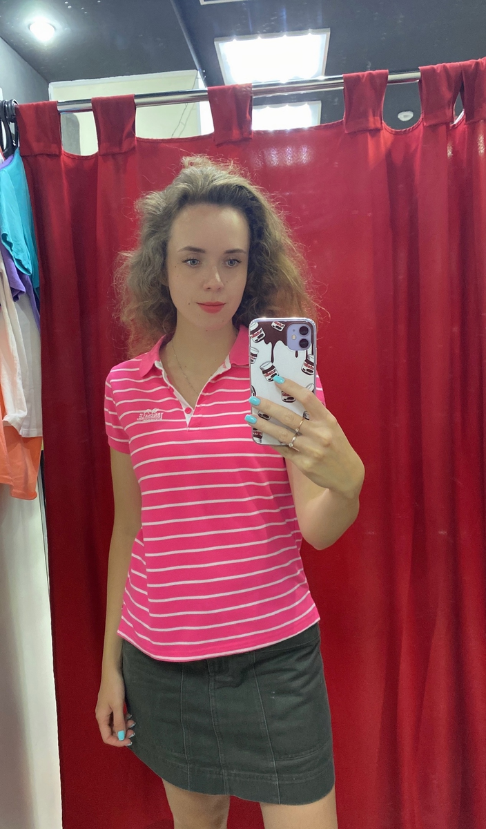 Сейчас ведь модно одеваться как барби? Всё чаще вижу, что блогеры подражают стилю этой куклы. Думаю, это связано с вышедшем фильмом. Я вот тоже решила освоить стиль барби, чтобы не отставать от моды. Шучу, просто так вышло, что в секонде попались подобные вещи. Думаю, такие вещи вполне могла бы носить барби, а надеваю их я. Например, понравилось розовое поло в полоску, очень уж яркое оно. Смотрится мило и как-то по-кукольному. Фасон стандартный, размер однозначно мой. Качество на высоте, да и состояние идеальное. Я вот долго раздумывала, покупать это поло или нет. Вот вроде бы оно мне и понравилось, но как-то душа не лежит. Слишком уж оно яркое, да и есть ощущение, что такой оттенок розового не для меня. А стоит оно недорого, всего 85 рублей. Можно было и купить, но я решила, что хватит мне одного розового поло. Решила ещё примерить боди. Застёгивать его было лень, поэтому накинула сверху. Состояние идеальное, видно, что вещь новая. В целом видит неплохо, и тоже вещь немного кукольная.