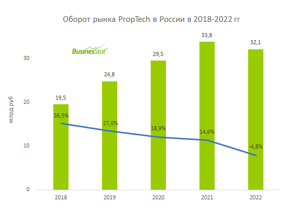В 2022 г оборот рынка PropTech технологий в России сократился на 4,8% и составил 32,1 млрд руб.