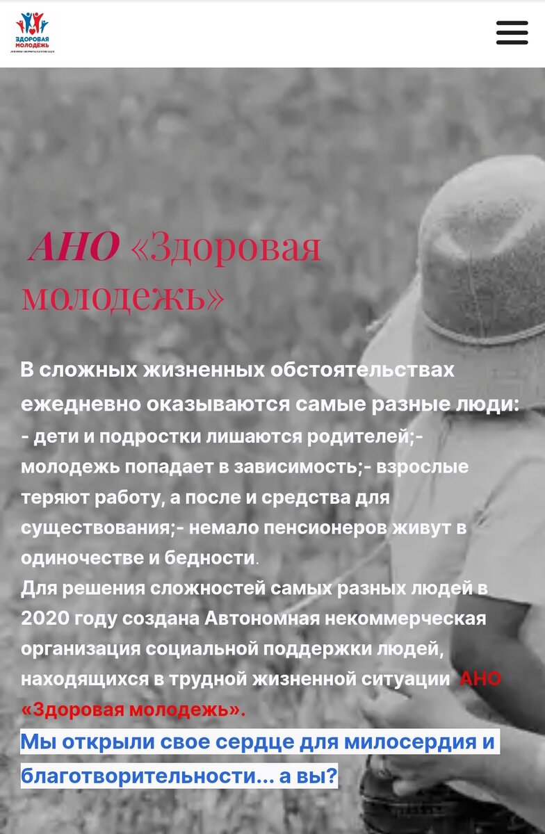 АНО "Здоровая молодёжь" ежедневно помогает людям, оказавшимся в трудной жизненной ситуации. Это могут быть дети, подростки, трудоспособные граждане, а так же пенсионеры и люди, не имеющие собственного жилья. Задачи организации Контакты центра Тел: +7(915) 853-35-37 Email: zm.lip48@yandex.ru Адрес:г. Липецк, ул. Индустриальная, дом. 87, помещ 3 https://здороваямолодежь.рф/