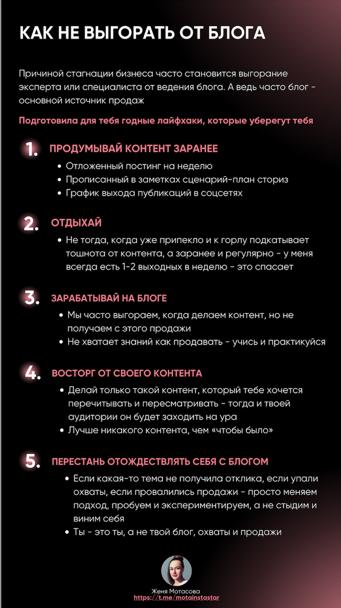 Причиной стагнации бизнеса часто становится выгорание эксперта или специалиста от ведения блога. А ведь часто блог - основной источник продаж. Подготовила для тебя годные лайфхаки, которые уберегут тебя 1.ПРОДУМЫВАЙ КОНТЕНТ ЗАРАНЕЕ - отложенный постинг на неделю - прописанный в заметках сценарий-план сториз - график выхода публикаций в соцсетях 2.ОТДЫХАЙ - не тогда, когда уже припекло и к горлу подкатывает тошнота от контента, а заранее и регулярно - у меня всегда есть 1-2 выходных в неделю - это спасает 3.ЗАРАБАТЫВАЙ НА БЛОГЕ - мы часто выгораем, когда делаем контент, но не получаем с этого продажи - не хватает знаний как продавать - учись и практикуйся 4.ВОСТОРГ ОТ СВОЕГО КОНТЕНТА - делай только такой контент, который тебе хочется перечитывать и пересматривать - тогда и твоей аудитории он будет заходить на ура - лучше никакого контента, чем «чтобы было» 5.ПЕРЕСТАНЬ ОТОЖДЕСТВЛЯТЬ СЕБЯ С БЛОГОМ - если какая-то тема не получила отклика, если упали охваты, если провалились продажи - прос
