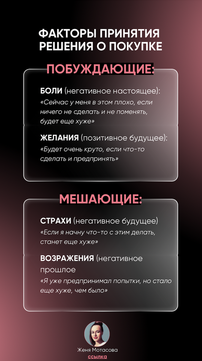 ПОБУЖДАЮЩИЕ: БОЛИ (негативное настоящее):«Сейчас у меня в этом плохо, если ничего не сделать и не поменять, будет еще хуже» ЖЕЛАНИЯ (позитивное будущее):«Будет очень круто, если что-то сделать и предпринять» МЕШАЮЩИЕ: СТРАХИ (негативное будущее) «Если я начну что-то с этим делать, станет еще хуже» ВОЗРАЖЕНИЯ (негативное прошлое) «Я уже предпринимал попытки, но стало еще хуже, чем было» Больше советов, практик и рабочих схем по продажам в моем тг-канале, переходи по ссылке и подписывайся https://t.me/motainstastar