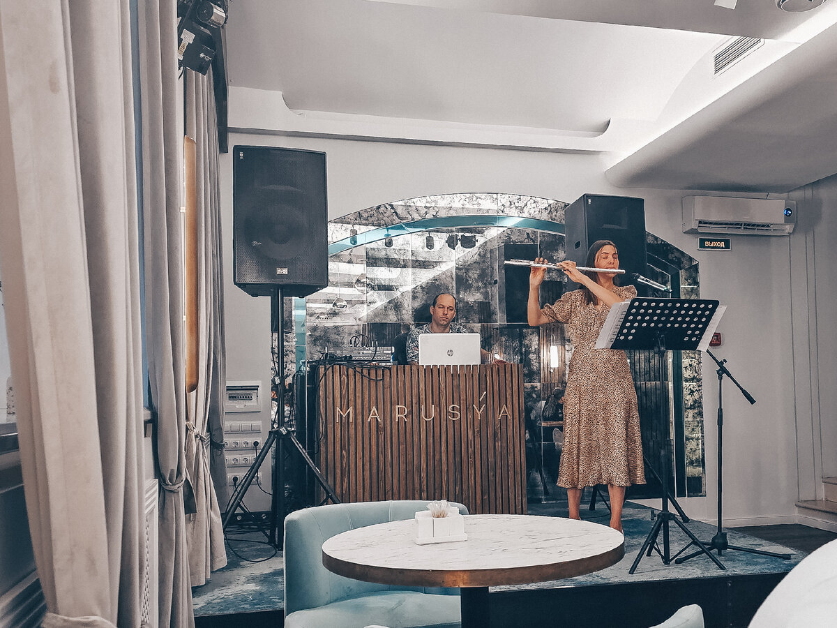 Помимо гурманских изысков нас к "Марусе" притянула живая музыка. В этом ресторане часто проходят музыкальные вечера. В наш вечер играла на флейте замечательная Александра Арефьева. В совокупности с уютной обстановкой ресторана все это создавало душевную атмосферу. Ходили мы на ужин с детьми, они тоже оценили и музыку, и кухню, и общие впечатления от этого вечера.