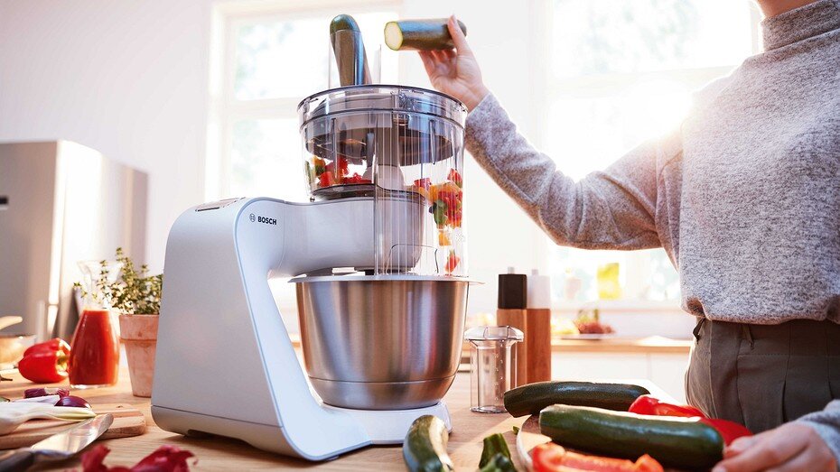 Например, в наборе с комбайном Bosch MUM 5 MUM58252 есть аж 11 дополнительных насадок, включая всевозможные ножи. Так что такое устройство поможет вам и колбасу кубиками на оливье нарезать, и грибы соломкой для жульена, и даже аккуратные палочки картошки фри.