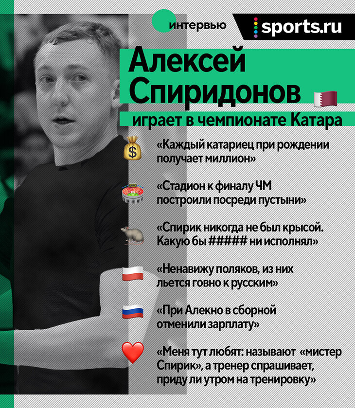 Говорить с ним – всегда весело. А сейчас еще и актуально. Скоро футбольный чемпионат мира, и вряд ли кто-то может рассказать про Катар вкуснее, чем Спиридонов. Он настолько освоился в Дохе, что позволяет себе пошлые шутки над арабами, но они уже не шарахаются, а от смеха валяются по полу вместе с ним. Это может означать только одно – Алексей стал своим и там.