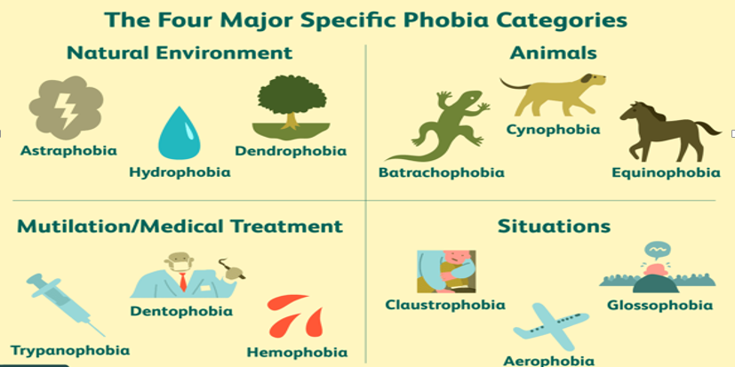 DSM-5 определяет специфические фобии как "интенсивный и неадекватный страх перед конкретным объектом или ситуацией, который приводит к избеганию или преодолению этого объекта или ситуации". DSM-5 критерии специфической фобии: A. Заметный страх или тревога по поводу специфического объекта или ситуации (например, полет, высота, животные, инъекции, вид крови). Примечание: У детей страх и тревога могут выражаться в виде страха, вспышек гнева, замирания или цепляния. B. Фобический объект или ситуация почти всегда вызывают немедленный страх или тревогу. C. Фобический объект или ситуация активно избегаются или их терпят с сильным страхом или тревогой. D. Страх или тревога непропорциональны реальной опасности, создаваемой специфическим объектом или ситуацией, а также социокультуральному контексту. E. Страх, тревога или избегание устойчивы, и обычно продолжаются в течение 6 месяцев или более F. Страх, тревога или избегание вызывают клинически значимый дистресс или ухудшение в социальной, профес
