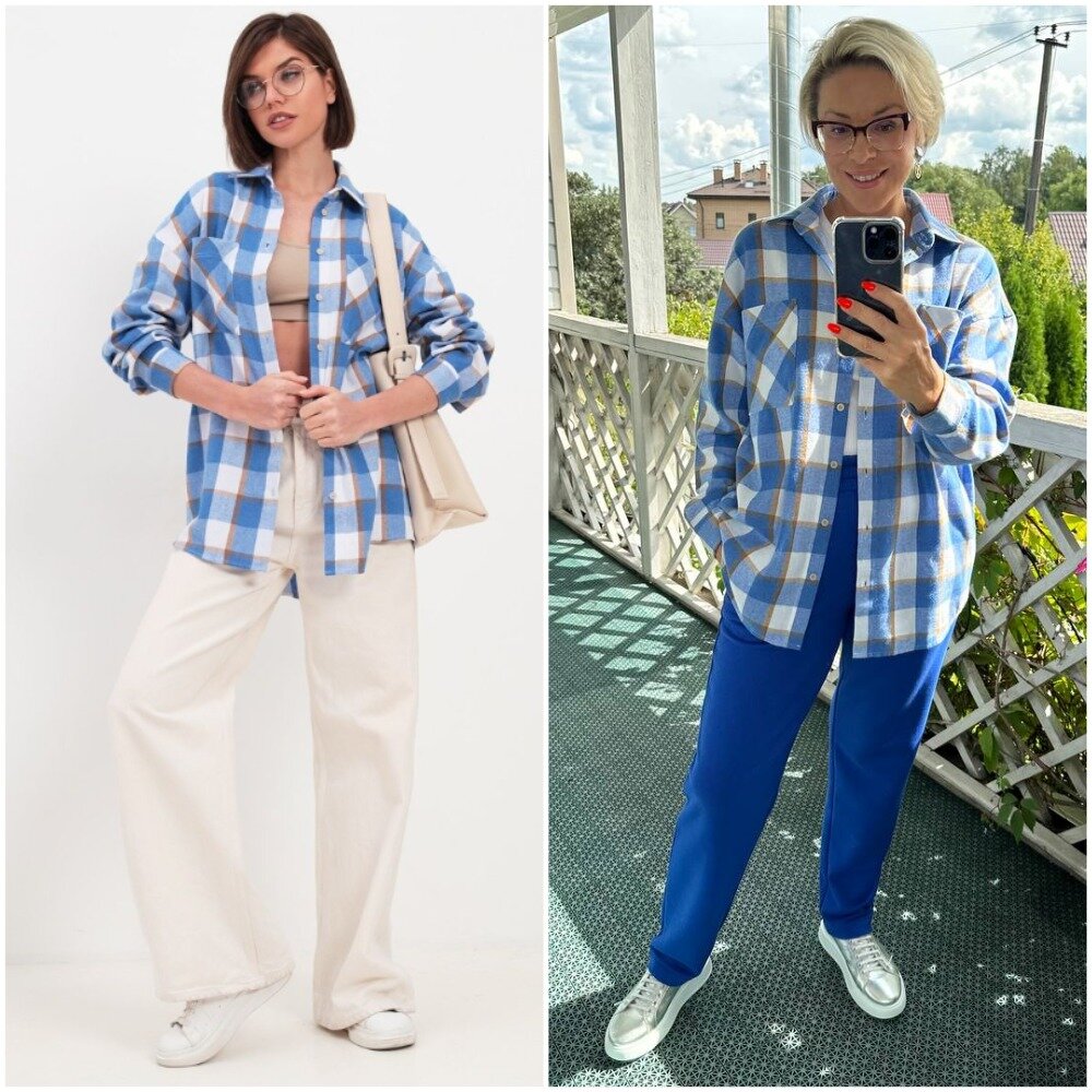 Очень понравилась эта рубашка своим цветом (несколько оттенков в принте), плотной тканью и кроем оверсайз. Сзади рубашка немного длиннее, чем спереди. На мне 46 размер - как видите, она достаточно свободная, поэтому не бойтесь брать свой размер (модель до 52). Рубашки в клетку я очень люблю использовать в многослойных образах. Также они стильно смотрятся со спортивными брюками и джинсами в комфортных повседневных образах. Надевая рубашку в качестве верхнего слоя, мы создаем дополнительные вертикали, которые вытягивают силуэт. В общем, вещь несомненно нужная в гардеробе.