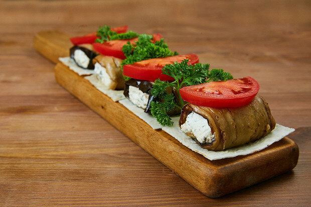 Классика грузинской кухни от Бадри Лемонджава, шеф-повара Megobari. В отличие от тех рулетиков, которые обычно готовили на праздничный стол советские хозяйки, внутри баклажанов здесь не топорный майонез, а молодой сыр надуги с нейтральным молочным вкусом и сливочной текстурой. Это полностью меняет финальный вкус блюда: у жареных баклажанов в сочетании с надуги проявляется ореховый привкус, а зеленая аджика заостряет давно известный кулинарный сюжет. 1.Надуги смешать со сметаной и сливками. Добавить аджику, мелкорубленые листья мяты и кинзы, слегка посолить и убрать в холодильник. 2.Баклажаны нарезать вдоль тонкими «языками» (на порцию нужно 4 ломтика). Обжарить на растительном масле с двух сторон до мягкости, остудить. 3.Выложить на каждый ломтик баклажана по 1 столовой ложке надуги и свернуть в рулет. 4.Украсить зеленью, ломтиками помидоров и подавать. Понравился рецепт — поделитесь им с друзьями в социальных сетях! Готовьте вместе с «Едой»!