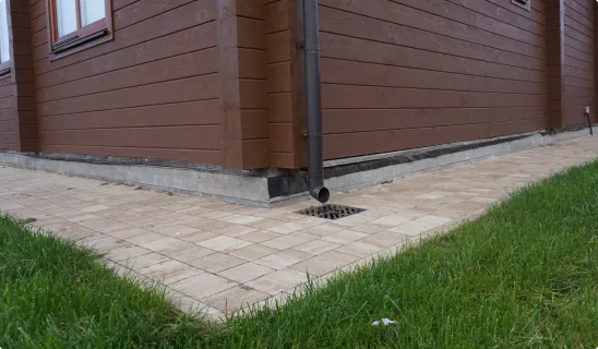 В отмостке также присутствует и другая конструкция для отвода воды — ливневка. Крыша дома — это большой водосборник. Вся влага с неё попадает в водосточную систему. Под водостоками, смонтированными на доме, устанавливаются дождеприёмники — специальные устройства, куда попадает вся вода с крыши. Они нужны не только для сбора воды, но и отлова мусора и песка. Из них очищенная вода попадает в трубы ливневой системы, которые также ведут в приёмный колодец или канаву.