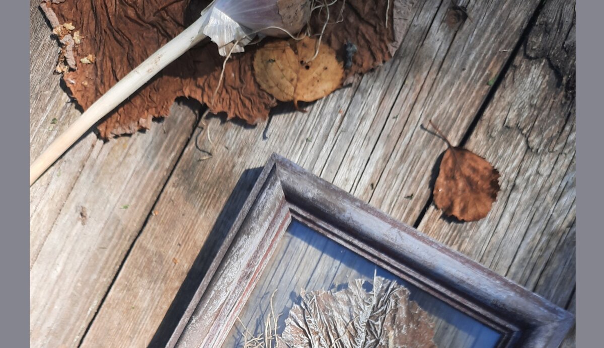 О!! Это значит 10 рамок с двойным стеклом и 10 без него? Так ведь тоже можно. Время гербариев, да, Жабка, не чужих, а наших? Огромный сухой лопух уже заждался своей участи. Нет, такого размера рамочки у нас, увы нет. Придется тебя фрагментировать, дорогой. А, ну чеснок, подвинься, разлегся тут в ящиках, мы творить будем! Ах, да чеснок! Его бородки - моя любовь. Сколько я уже про них тут добрых слов говорила. Ладно, лежи, ты тоже пригодишься. А еще что? Да что найдем вокруг. По ногами буквально. Нет в деревне магазинов и даже краска засохла. Придется обходиться, чем есть. Ну и стали обходиться Сначала сделали из лопуха фон, чу