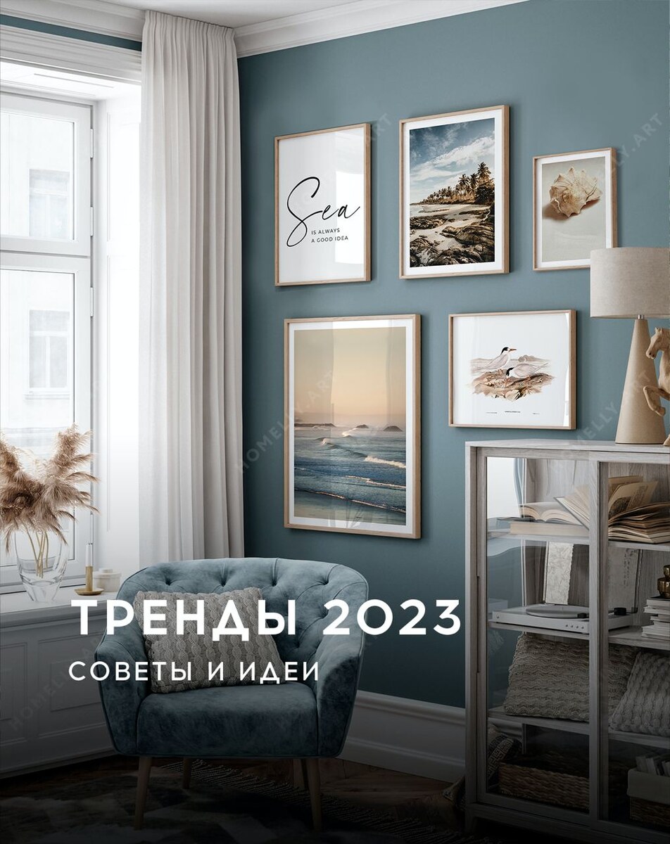 Советы и идеи магазина постеров Homelly.Art Главный тренд 2023 года – сочетание красного и синего. После периода нейтральных цветов и спокойных интерьеров, все чаще стали появляться яркие цвета для декора. Все оттенки синего, “водная” тема будет очень популярна, особенно в весеннем декоре. Оживите интерьер, черпая вдохновение у моря. Тенденция 2023 года – показать, как наша история переплетается с нашим настоящим и будущим. Так что приготовьтесь снова влюбиться в цвет и форму, сочетающие в себе прошлое и настоящее. Полоски возвращаются! Самое время использовать все виды узоров. Цветочные, графические узоры, и даже пэчворк. Мягкие, и теплые тона персика. Этот обволакивающий оттенок хорошо соединяется с красно-оранжевой цветовой гаммой, добавляет в дом тепло и уют. Мы все больше хотим окружить себя зелеными тонами и большим количеством растений, а в 2023 году можно черпать вдохновение из маленьких лесных грибов! Светильники, текстиль и постеры на кухне — самая модная вещь от природы в 20