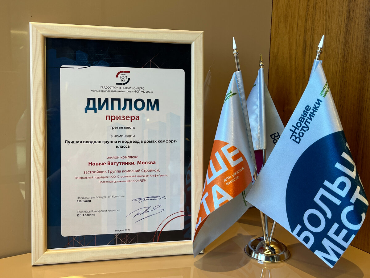 Проект 2/2 района Новые Ватутинки вошёл в топ-3 по итогам летнего градостроительного конкурса «ТОП ЖК-2023» среди жилых комплексов-новостроек в номинации «Лучшая входная группа и подъезд в домах комфорт-класса». Церемония награждения дипломами призеров и победителей конкурса прошла в Москве в рамках IV Конференции «Цифровизация в девелопменте». На конкурс было подано 672 заявки из 48 регионов России. Призеров определили по 12 номинациям, в каждой из которых было подано в среднем 56 заявок. Награду вручил председатель Комитета Торгово-промышленной палаты (ТПП) РФ по предпринимательству в сфере строительства Ефим Басин и председатель Комиссии Российского союза промышленников и предпринимателей (РСПП) по жилищной политике Леонид Казинец. Конкурс «ТОП ЖК» проводится ежегодно с 2020 года.