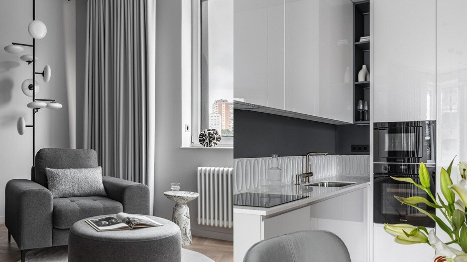 Думаю, этот проект — прежде всего наше (мое и заказчицы) прочтение минимализма. Мы старались соблюсти чистоту линий, использовать только функциональные предметы, при этом выбирали такие модели, которые сами по себе выступают декоративными элементами, их интересно рассматривать. В квартире есть ощущение «воздуха», хотя площадь небольшая. Проект получился графичным, но в нем все же присутствуют нежные женские нотки. Например, в форме плитки на фартуке кухни, которая так хорошо смягчает темно-серую краску выше.