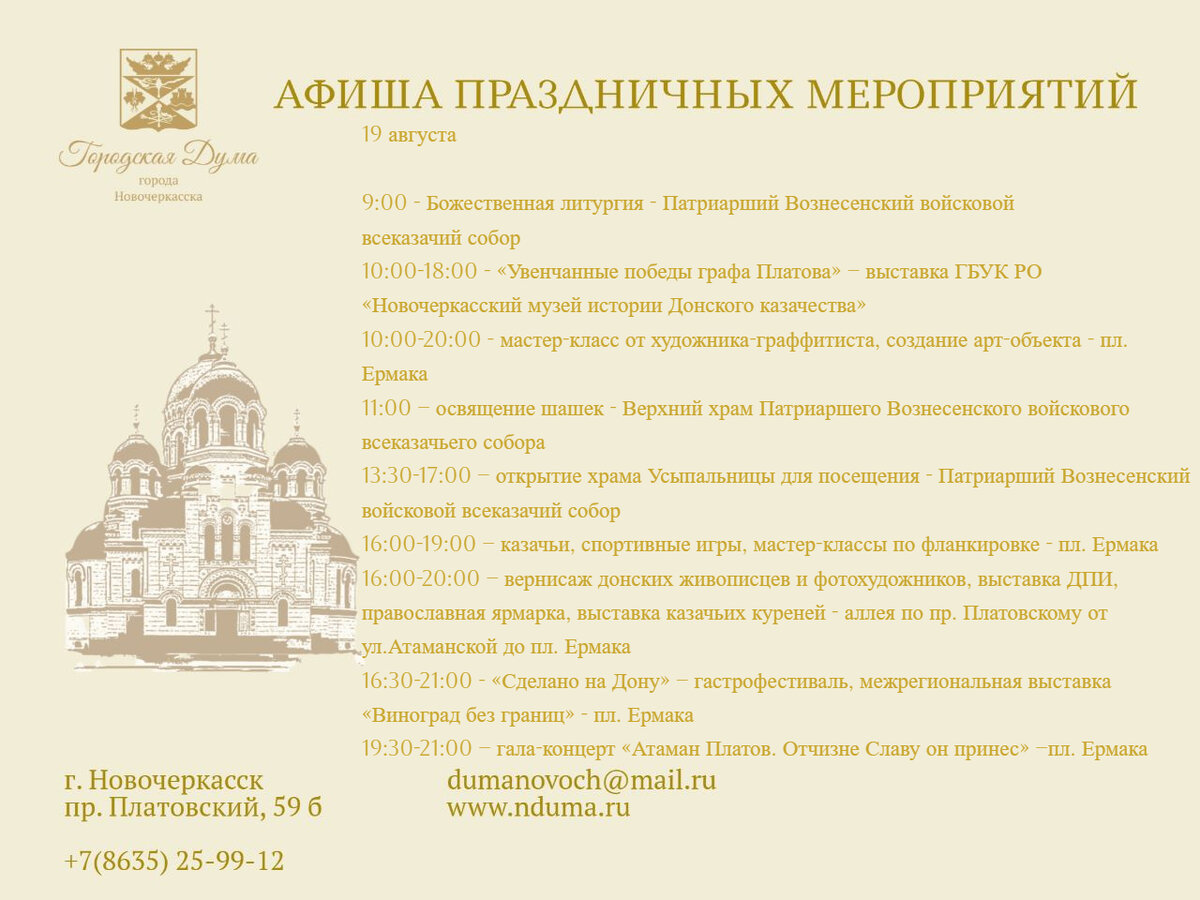🎆Выставки, вернисажи, стрит-арт, песенная поляна и гастрофестиваль ждёт жителей и гостей Новочеркасска 19 августа с 17 до 20 часов на площади Ермака. Участники действа смогут познакомиться с творчеством местных мастеров, попробовать казачью кухню и оценить донские сорта винограда, а также впечатлиться большим гала-концертом у стен Вознесенского Кафедрального собора. Подробнее о мероприятиях в честь 270-летия основателя Новочеркасска Матвея Ивановича Платова – в афише управления культуры и искусства.
