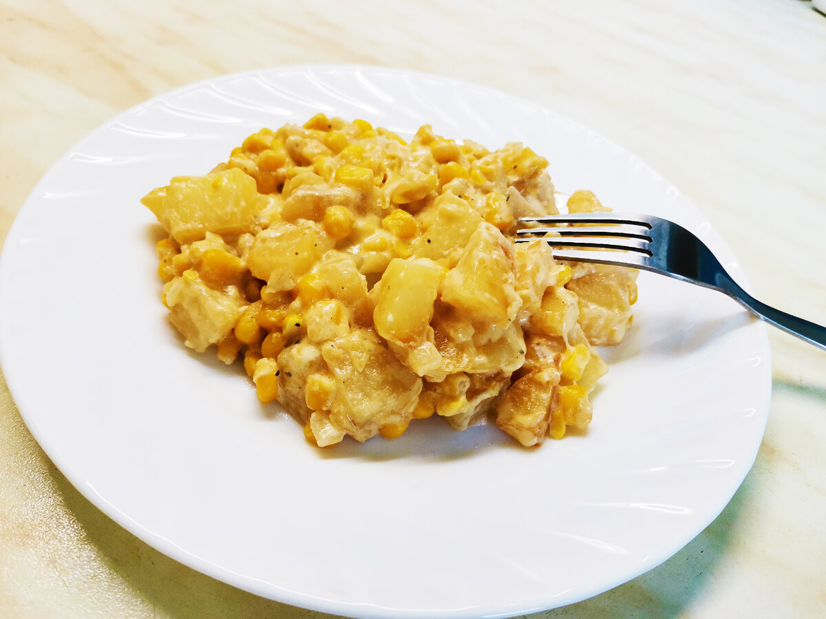 Картофель, консервированная кукуруза, сливки 20% и сыр