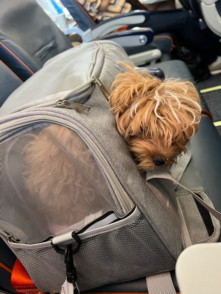 Мы успели перекусить, поработать и после отправились на посадку ✈️ Щенок у меня - золото, ни к кому не лез, мирно шёл рядом, лишь на посадке меня попросили усадить его в мягкую переноску 🐶 Немного повозмущавшись, отчего же он заперт, собакен не придумал ничего лучше, чем просто лечь спать… чем и занимался весь полёт)